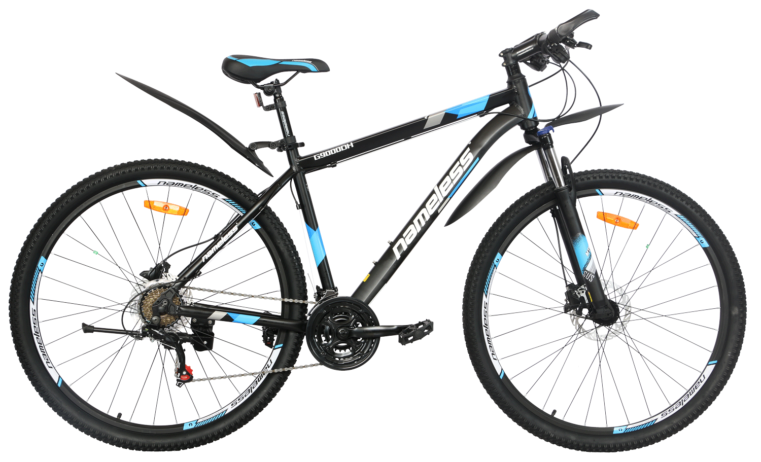 Найнеры можно назвать универсальным типом байков, так как в огромной коллекции найдутся подходящие варианты и для простых любителей велопрогулок, и для профессионалов. Велосипед Nameless G9000DH 29 (2021) — образец идеального сочетания хороших скоростных характеристик и максимального комфорта. Выпущен в 2021 году. Колеса 29" дюймов отлично переносят высокие нагрузки. Дисковые гидравлические тормоза хорошо слушаются, что гарантирует успешное выполнение любых маневров. Модель не боится сложных трасс и бездорожья.